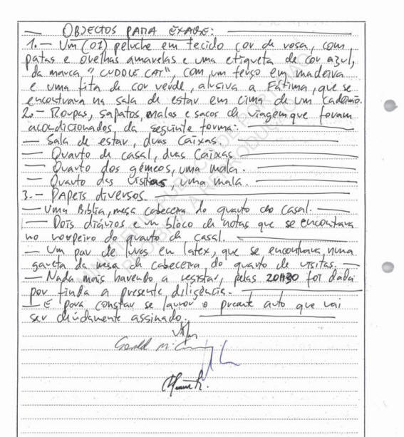 Following the search effected at Rua das Flores, 27, during which certain items were seized, this present inspection was performed, in a place appropriated for its purpose, attempting to identify particular pieces of clothing possibly indicated by the dogs, namely Eddy [that] indicates cadaver odours and Kila [that] indicates blood odours.
