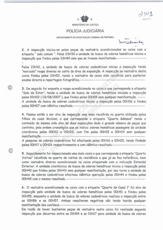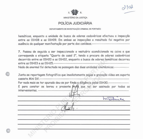 Official record of the canine inspection at 18h14 on 2 August 2007 at the current residence of the McCann couple situated at Rua das Flores, 27, Praia da Luz, Lagos.
