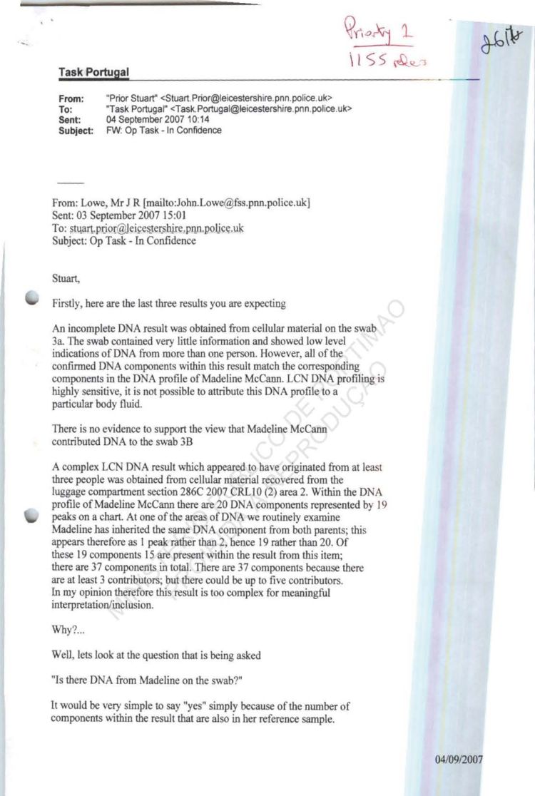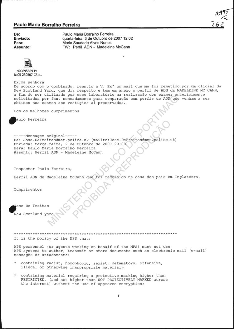 With the aim of providing the Police Scientific Laboratory with the DNA profile of Madeleine McCann, in order to be able to carry out comparisons with DNA that have been identified in the examinations requested, within the sphere of collaboration that exists between the PJ and the UK authorities, I telephoned Mr Jose de Freitas, a New Scotland Yard Officer, whom I asked to email me the childs DNA profile which was determined in analyses carried out in a UK laboratory, previously referred to in a letter that is part of this process.