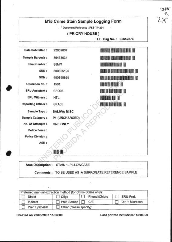 275 to 281 B15 Crime Sample Logging Form (Priory House) with report of Madeleine's DNA analysis