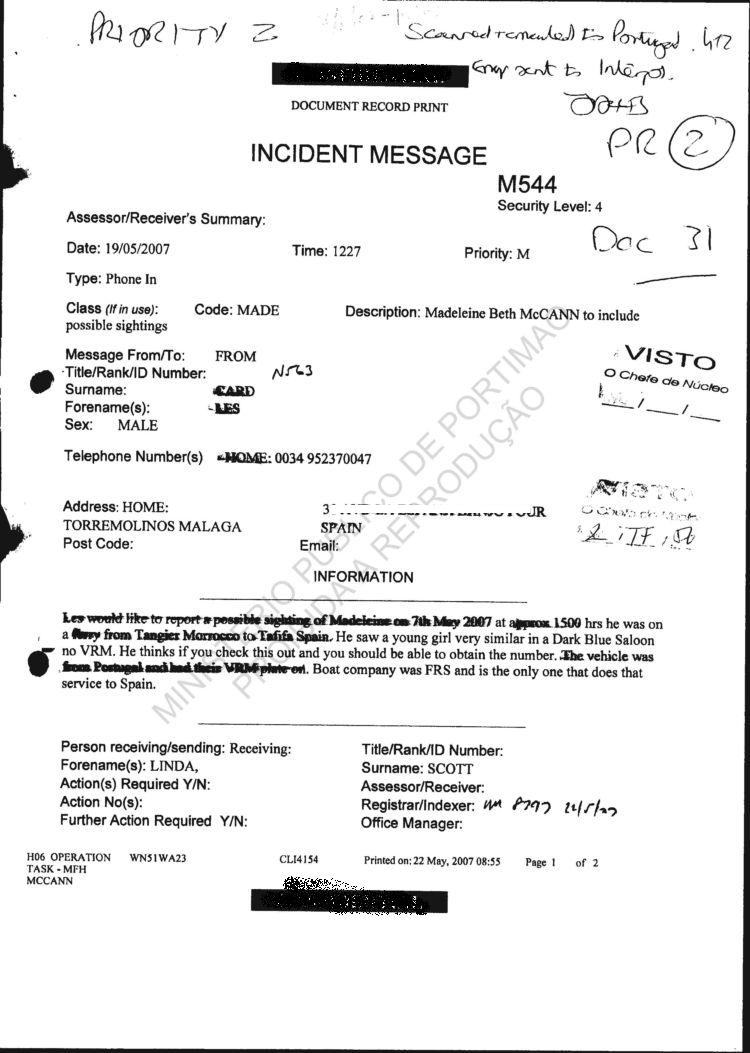 Les would like to report a possible sighting of madeleine on 7th