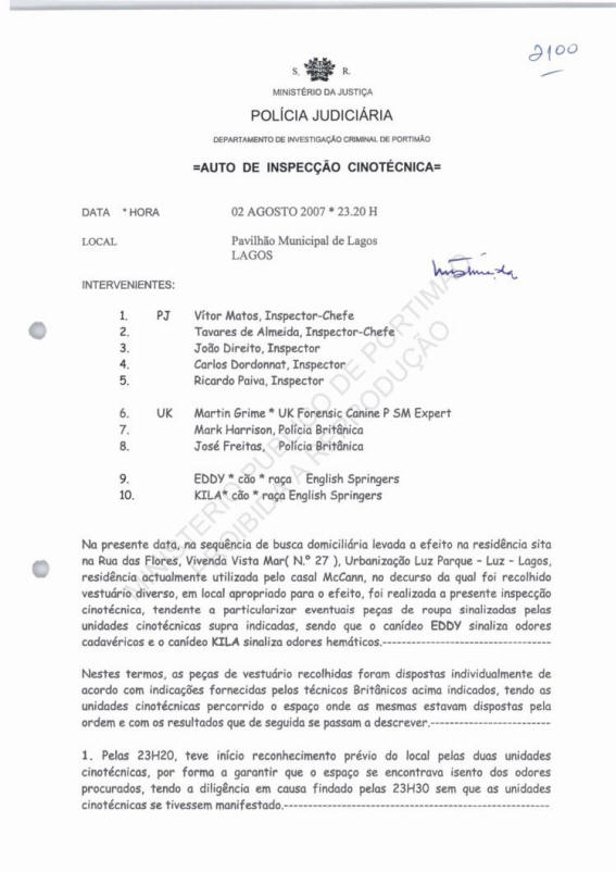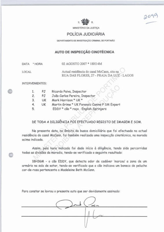 Official record of the canine inspection at 18h14 on 2 August 2007 at the current residence of the McCann couple situated at Rua das Flores, 27, Praia da Luz, Lagos.