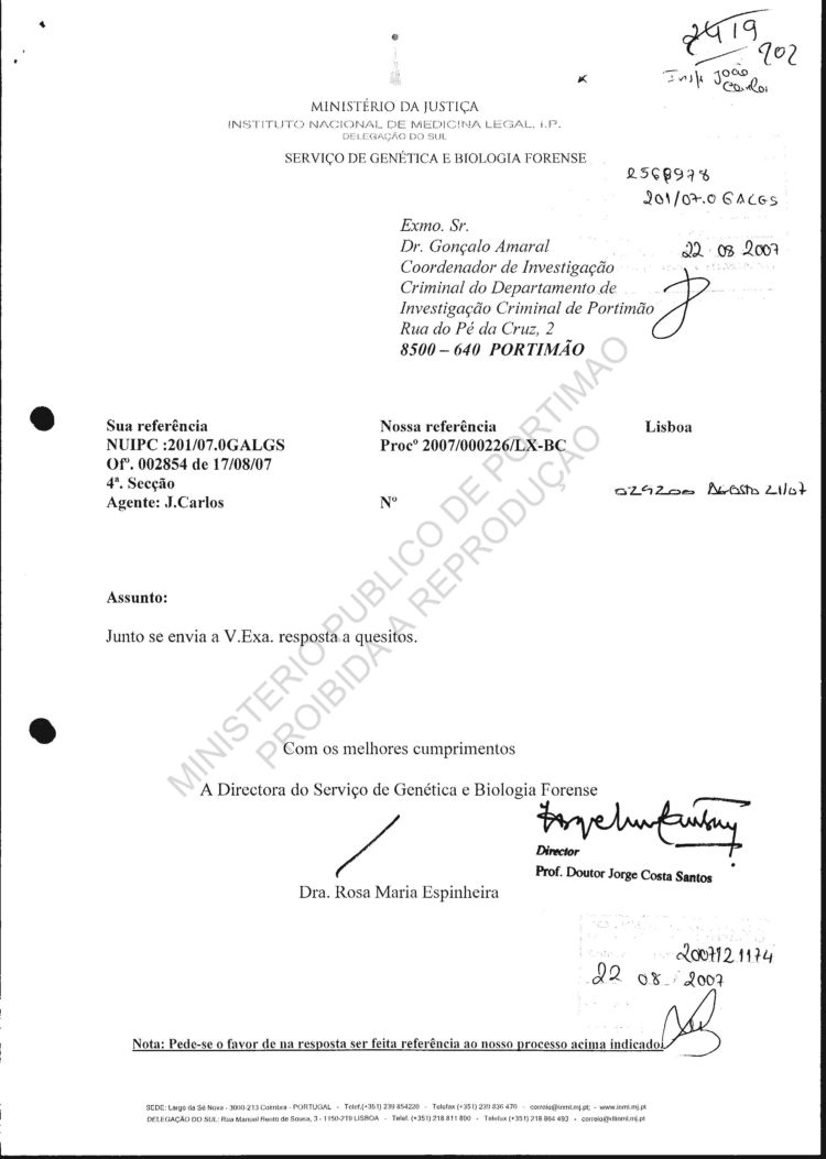 Letter to Dr. Gonçalo Amaral from the PT Genetic & Biological Forensic Service