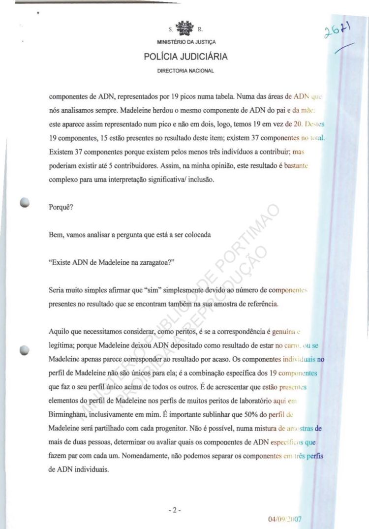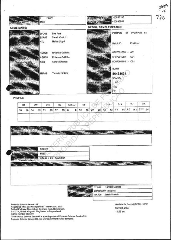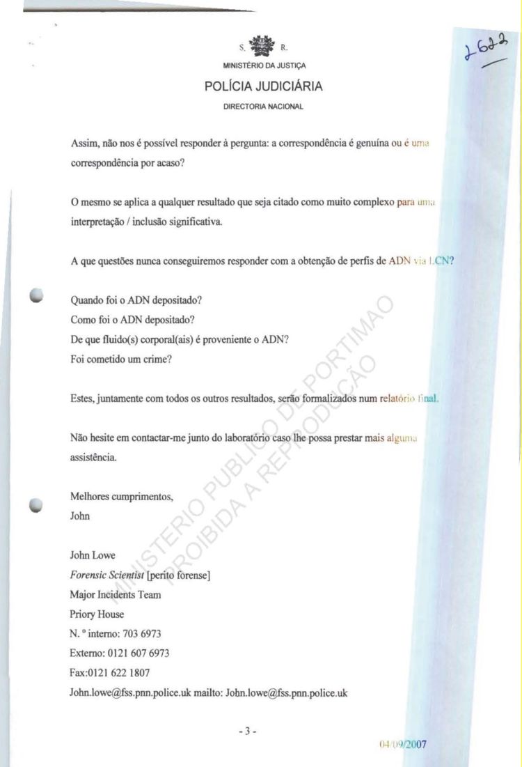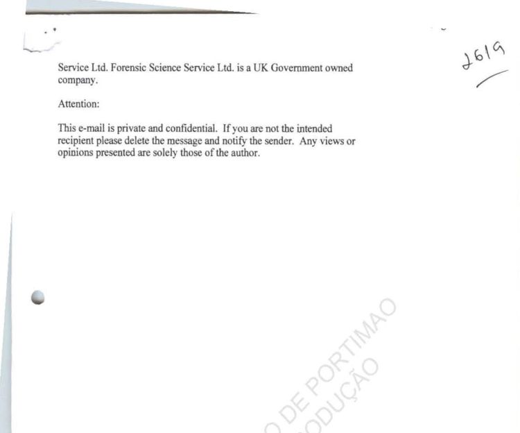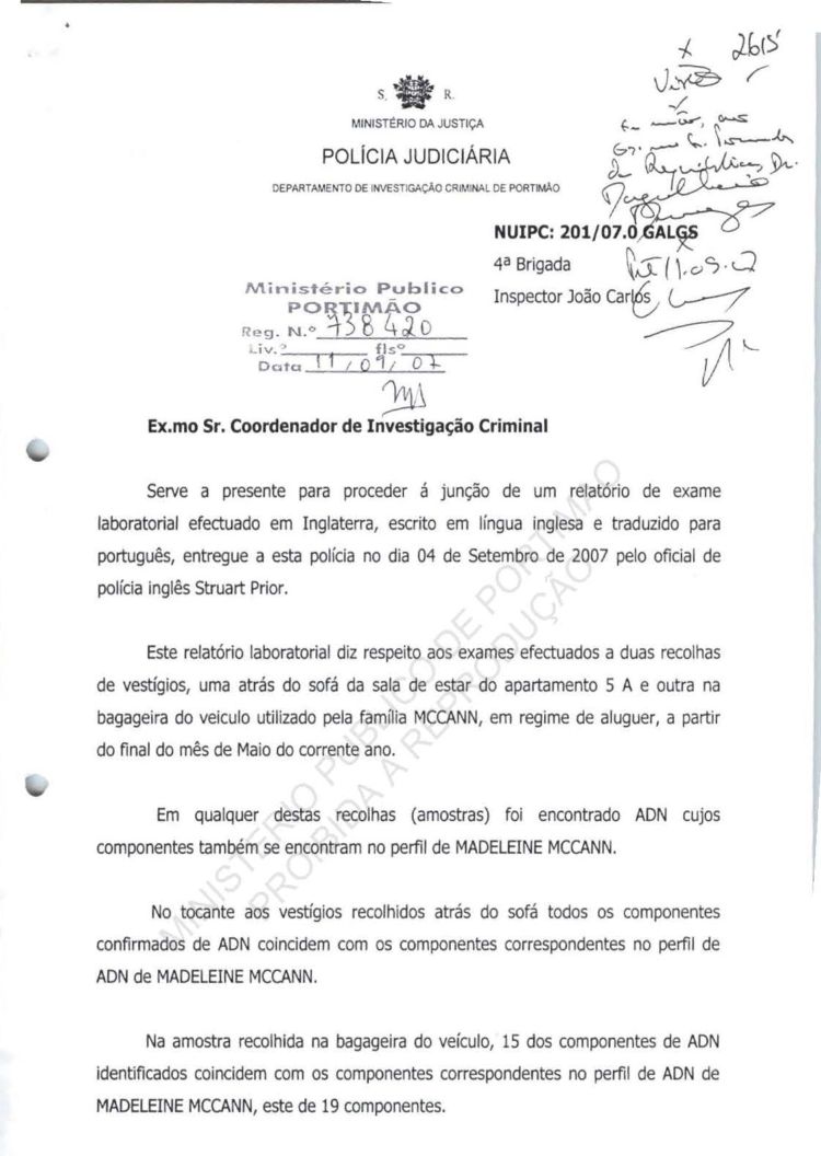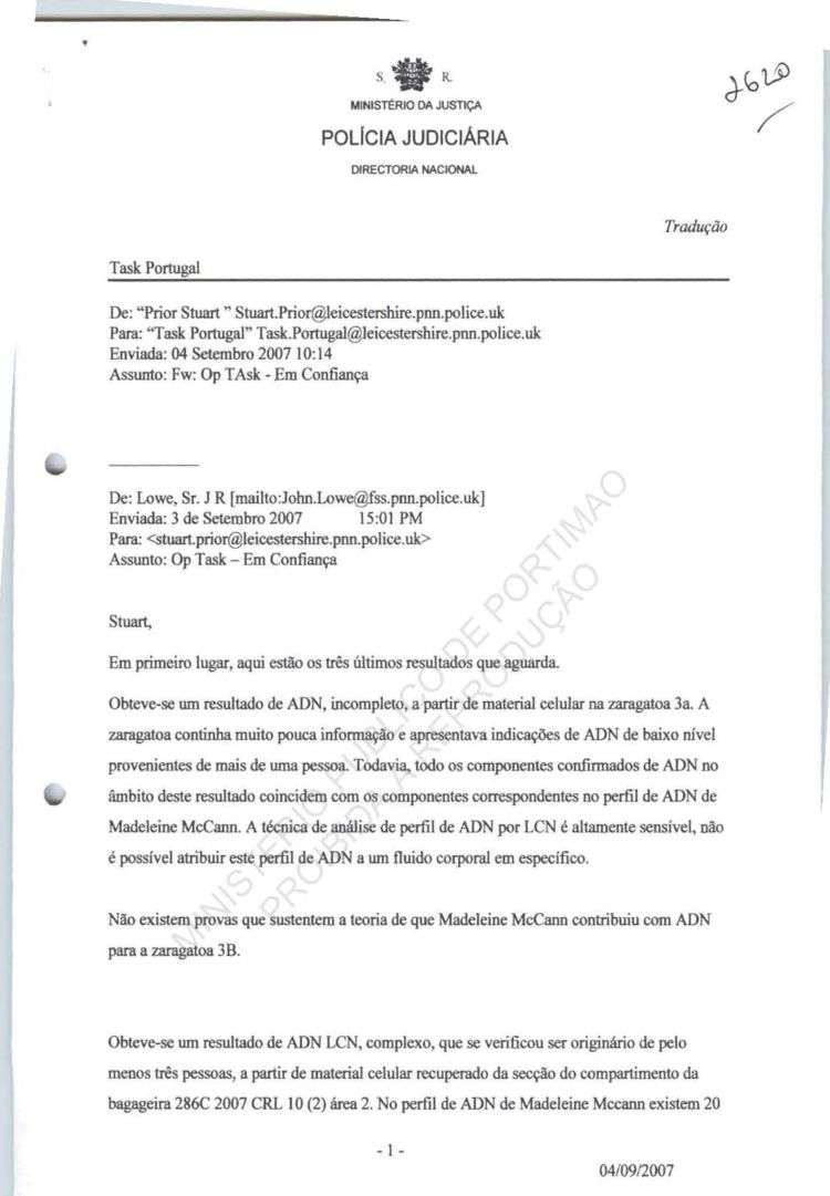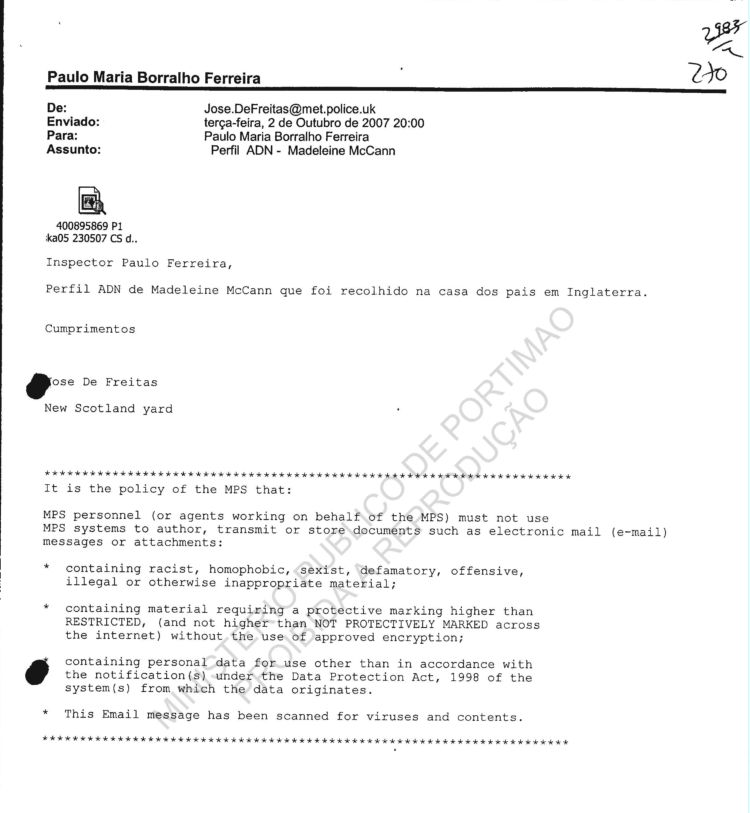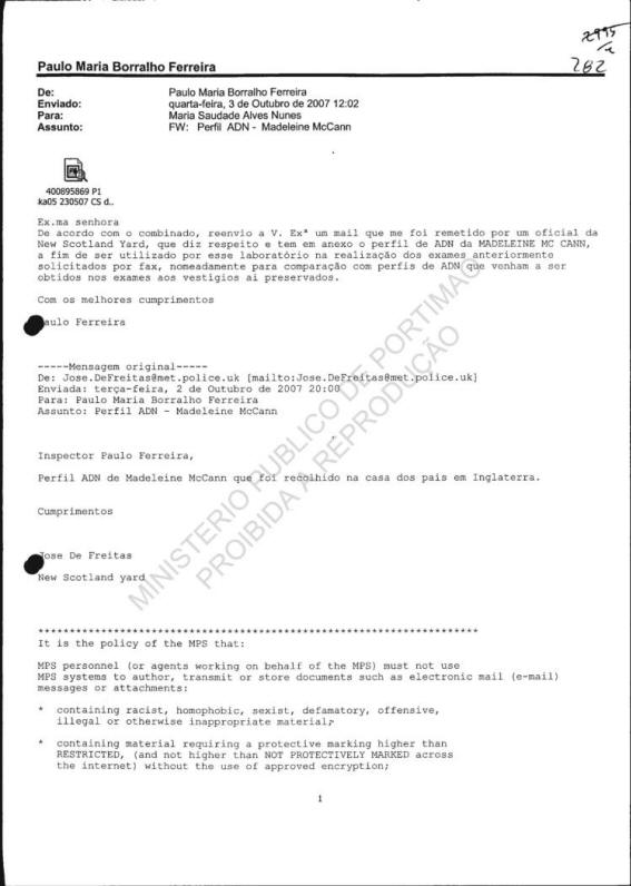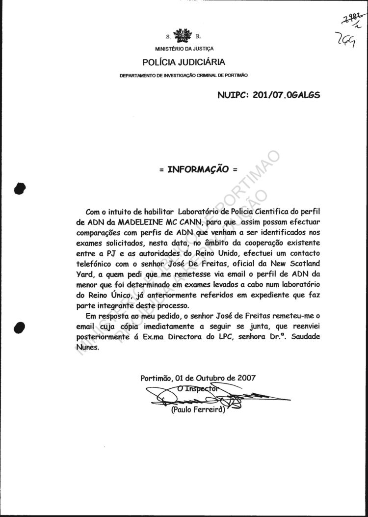 With the aim of providing the Police Scientific Laboratory with the DNA profile of Madeleine McCann, in order to be able to carry out comparisons with DNA that have been identified in the examinations requested, within the sphere of collaboration that exists between the PJ and the UK authorities, I telephoned Mr Jose de Freitas, a New Scotland Yard Officer, whom I asked to email me the childs DNA profile which was determined in analyses carried out in a UK laboratory, previously referred to in a letter that is part of this process.