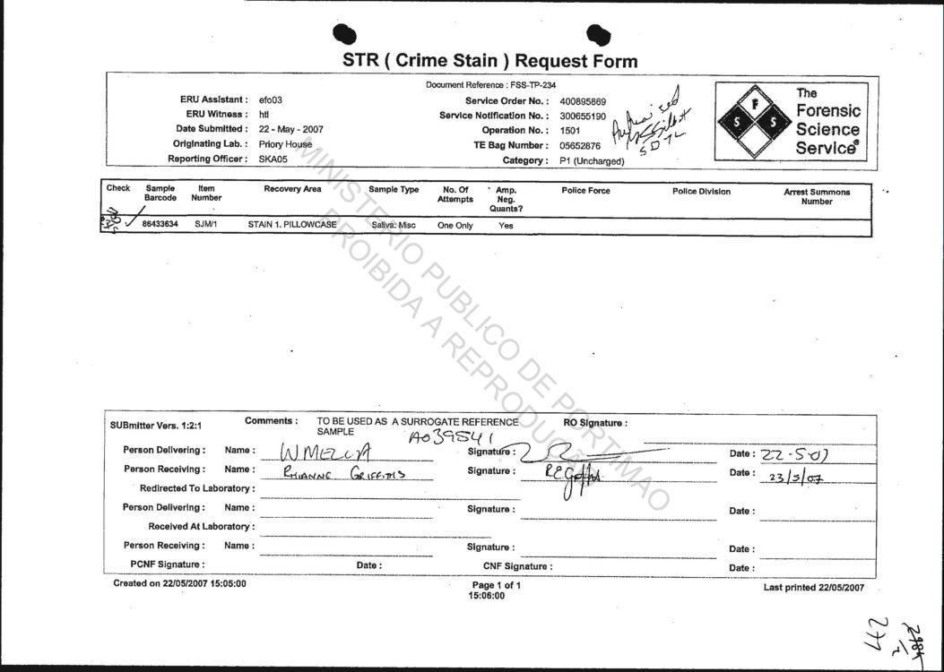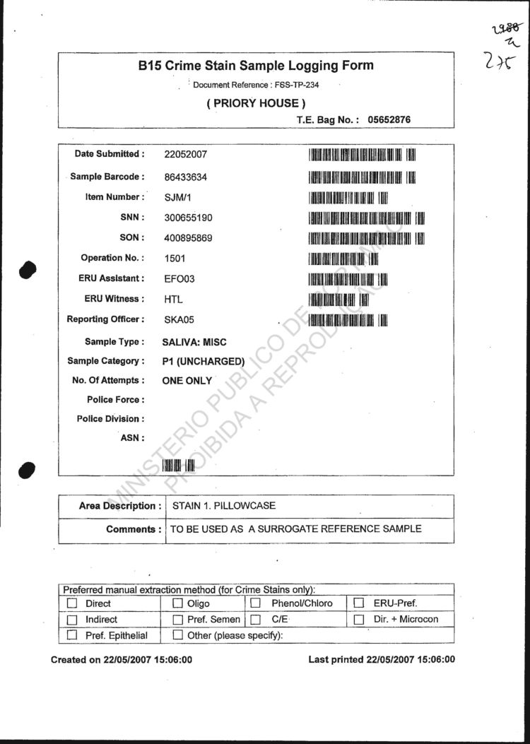 275 to 281 B15 Crime Sample Logging Form (Priory House) with report of Madeleine's DNA analysis