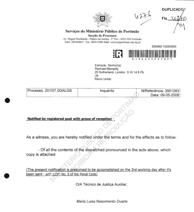 parts. The main case file (Processo: 17 volumes, 4,717 pages) supported by the file of sightings (Apenso 5: 14 volumes, 2,550 pages), other appendices (Outro Apensos: 21 volumes, 3,407 pages) and interviews conducted in England under a request for Mutual Legal Assistance (Cartas Rogatorias: 9 volumes, 549 pages. Total - 1.07GB.